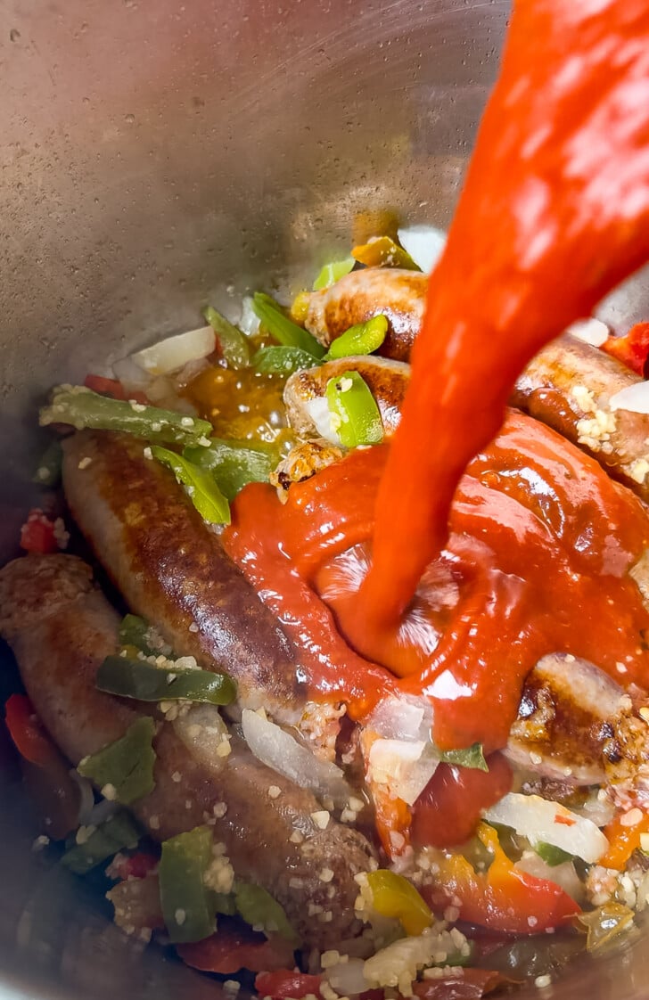 - Add the garlic, peppers, onions, and all the seasonings, then gently pour the marinara sauce over the top.