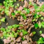 Next, begin browning the breakfast sausage. Add any remaining bell pepper or onion if desired. Using the spatula, break the sausage up into small pieces as it cooks.